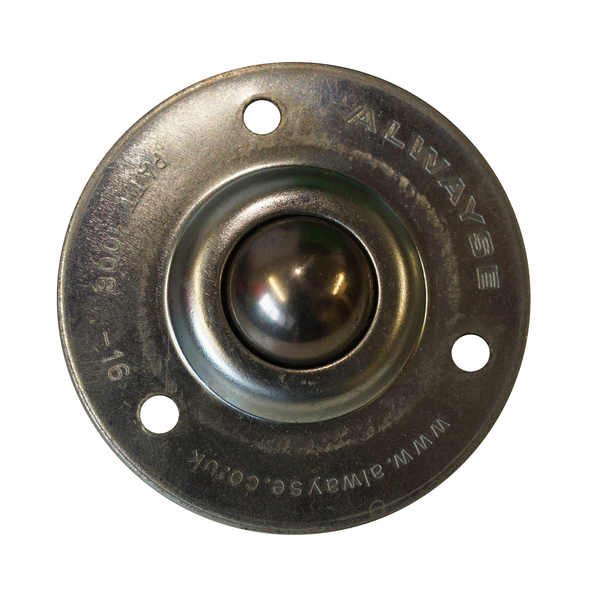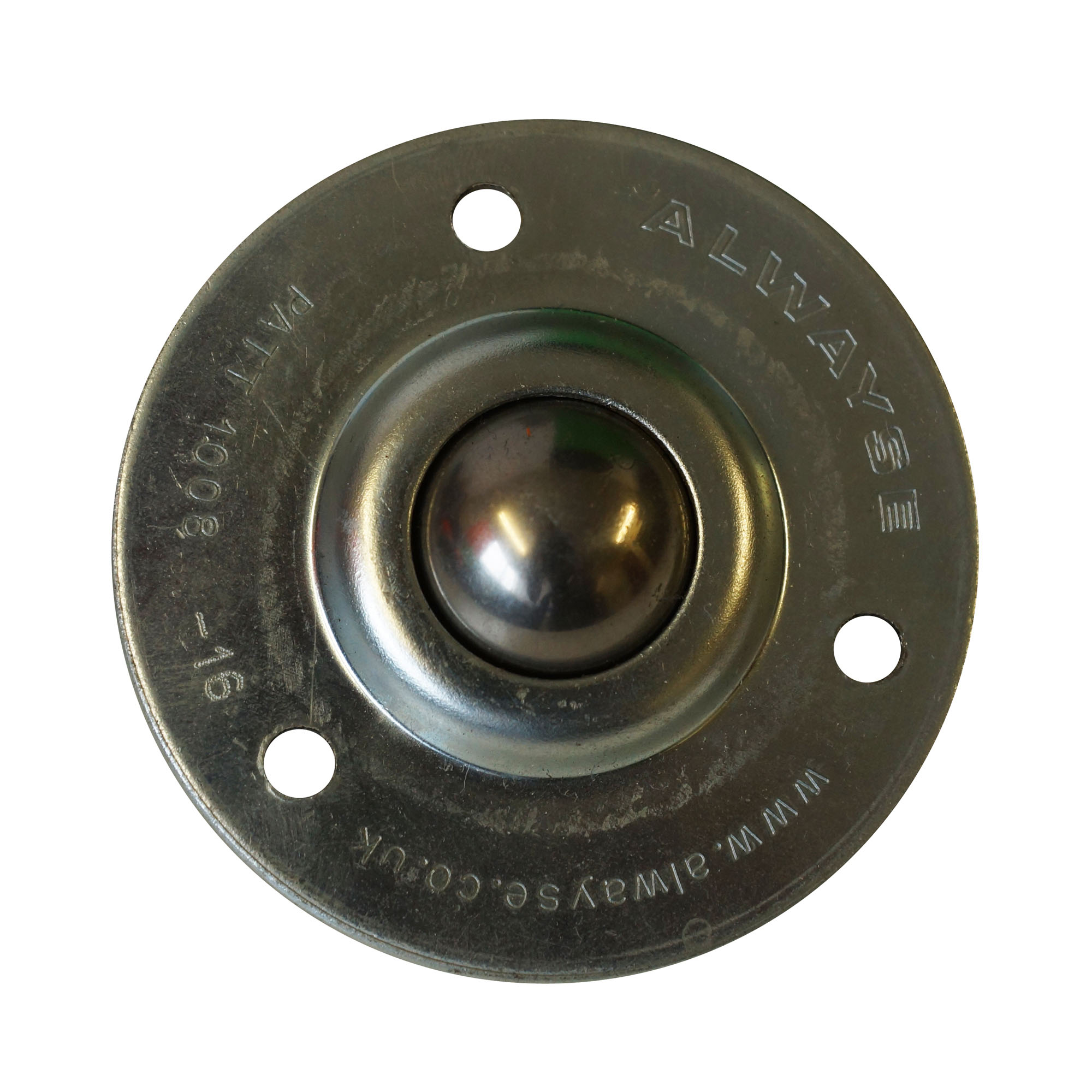 General purpose pressed steel ball transfer unit with a low profile and dirt exit hole.