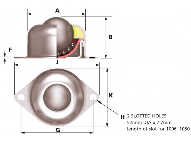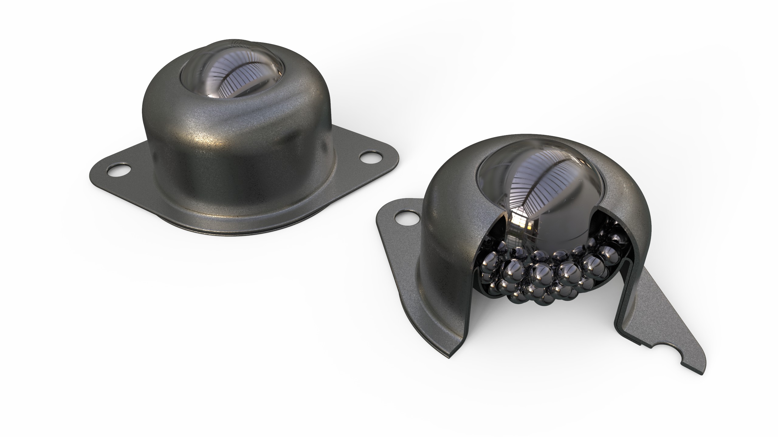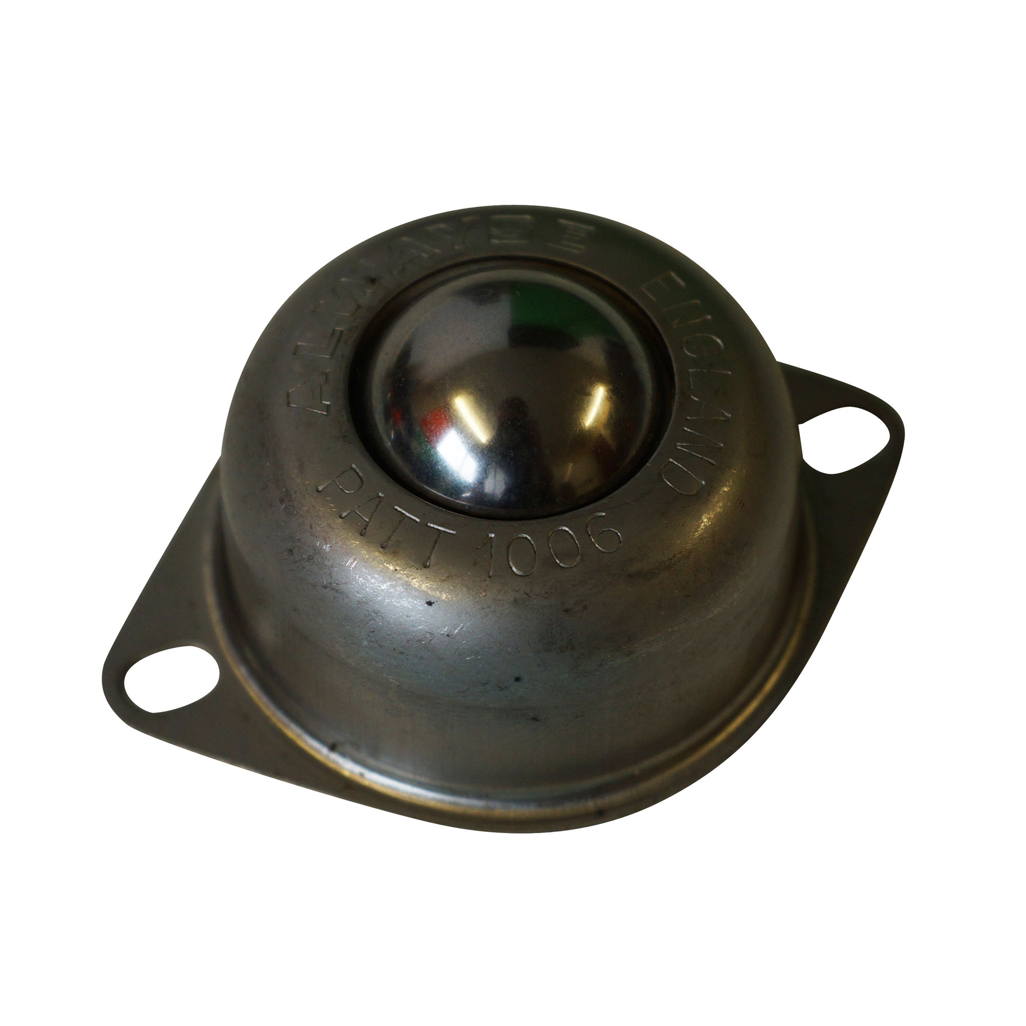 High load capacity ball transfer unit with two frill hole fixings and dirt exit hole.