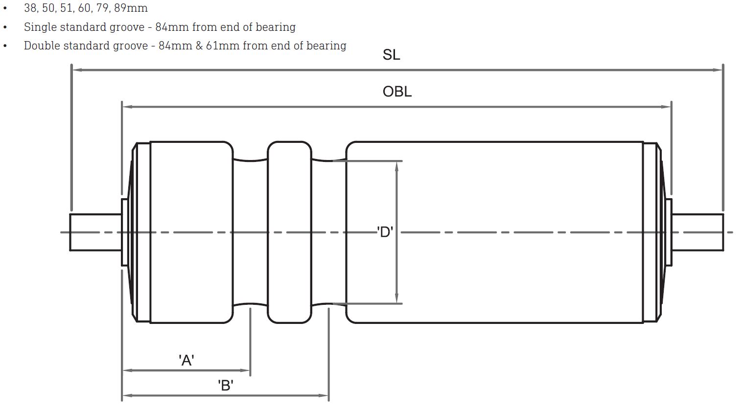 • Single standard groove - 84mm from end of bearing• Double standard groove - 84mm & 61mm from end of bearing