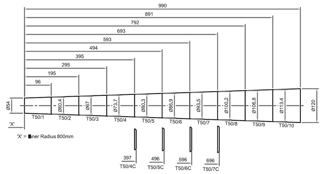 • Black Polypropylene Tapered Elements• Fitted to any Ø50mm Roller Tube• Inner Radius 800mm• Tracks items around conveyor bends• Recommended with 507T end cap to retain tapered elements.