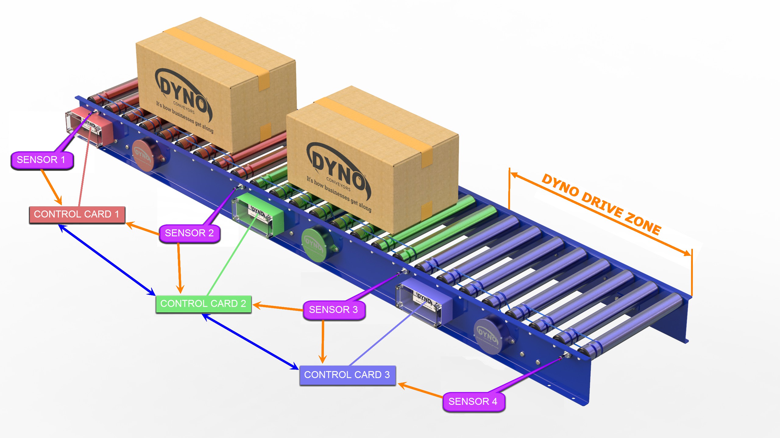 As the loads are conveyed along the conveyor, the photocell sensors inform the control card that product is present. The control card then checks that the forward zone is unoccupied. If the zone is clear, the downstream motor starts thus enabling the product to be passed forward where the action is repeated.